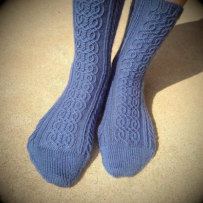 This cuff-down sock uses twisted cable stitches. It is written in one size, but is relatively stretchy and can be knit to any length desired. Suggestions are given for where to add extra stitches to increase circumference.