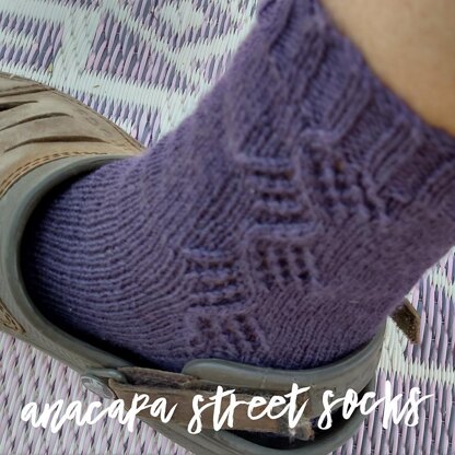 This is a comfortable sock, with a cable and lace motif down each of the leg. It has a ribbed heel that snugs up nicely around the ankle. Instructions are both written and charted, and are easily memorized, making this a good travelling project. There are three sizes, which will easily accomodate almost any size. It is very straight forward and lots of fun, suitable for both for the beginning sock knitter and the more experienced.