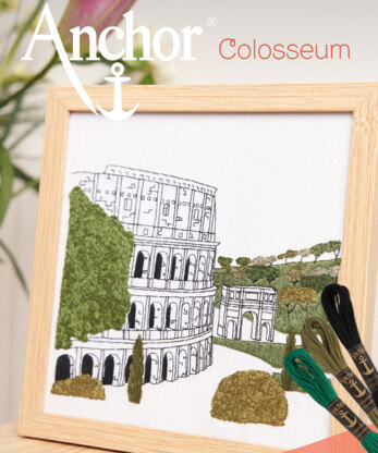 A modern embroidery with a classic view of the Colosseum in Rome made with Anchor Stranded Cotton.