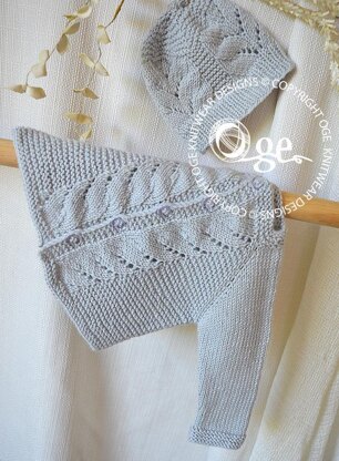 The simple little top down cardigan is worked in garter stitch with sleeves worked in stocking stitch and has a delicate leaf pattern running down each side at the front. A simple neckline, no seaming required. This pattern also comes with a matching hat.