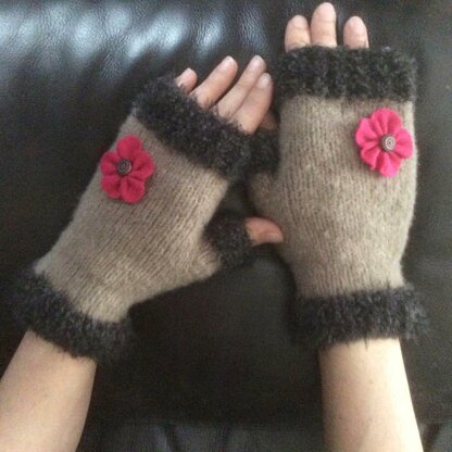 Vous aurez les mains bien au chaud avec ces jolies mitaines ! Tricotée avec PILOU+ de Phildar qui allie douceur et élasticité et MARMOT de Berroco pour son effet ''nounours' tout doux. Une petite fleur en feutrine, décoré d'un joli bouton vient égayer le tout !