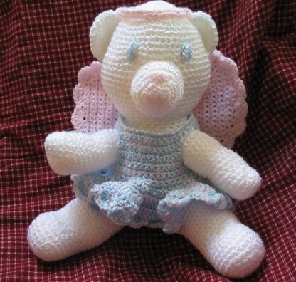 This sweet little bear sports a halo, wings, and a ruffled dress. Soft and squishy, she would make a perfect gift for a new baby. The dress is removable while the wings and halo are sewn down. Embroidered features make the toy safer for young children.