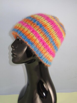 This is my Angel Print Mohair All Rib Beanie Hat knitting pattern. This lovely beanie is really quick and easy to make because its knit on 5 mm needles using 3 balls of this lovely yarn together. This technique also makes it extra warm to wear.