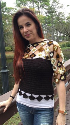 Angled Squares is the perfect combination of linked half double crochet for coverage, and join-as-you-go granny squares to create wide open spaces. Stitch the yoke in coordinated colors of sock weight yarn, then build the front and back of the sweater down and seam the sides.