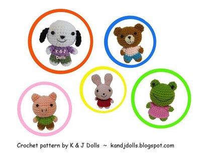 Crochet pattern for 5 cute little animals: a little bear, piglet, frog, puppy and bunny. The pattern is written in English (using US crochet terms). It is 11 pages long and contains 16 photos. The dolls are very easy and quick to make.