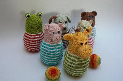 There are 6 pins in a form of animals - a frog, a giraffe, a bear, a cat, a dog, and a pig plus two nice rainbow color balls. The pins are about 21 cm (circa 8 inches) tall and the balls are size of tennis balls (there is a real tennis ball inside)