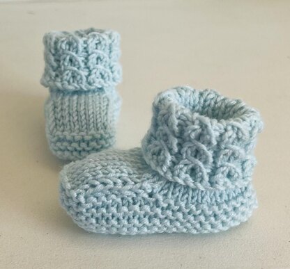 A cute and easy to knit baby booties with a mock cable pattern ankle cuff. Super cute and quick and easy to knit up. These booties would make a lovely gift while being practical and keeping babies feet warm and cosy. This pattern is suitable for a beginner knitter who has mastered the basic knitting techniques, to the more experienced knitter who would like an easy, row-by-row pattern to follow. Knitted in DK yarn on 3.25mm (US 3) and 3.75mm (US 5) single point knitting needles. These booties are knitted flat and seamed afterwards. Matching bonnet available in my shop
