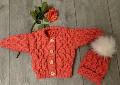 ANNE is a gorgeous Aran pattern with a striking cable. Knitted on straight needles. Anne is a jacket and the sizing comes up bigger so by adding on extra length to arms and body, it would easily fit 3 years.