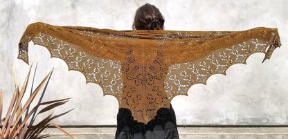 This is a pattern for a triangle shawl with a bunch of lace and rows of beads at the end. It is worked flat, from the top down.