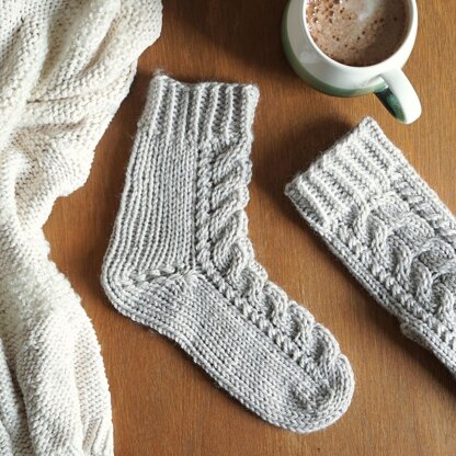 Wrap your feet in warmth with the Annie Socks, a super comfy pair of bed socks designed for beginners! Knit using Drops Alaska yarn and 5mm needles, these socks work up quickly and feature a simple cable pattern running down the front—perfect for those new to both sock knitting and cabling.