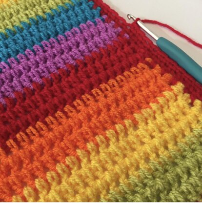 I designed this blanket as I wanted to create something bright and cheerful and think that this vibrant rainbow palette works really well. This pattern is ideal for beginners and the nature of stitching into the spaces means that it works up fairly quickly and also gives the blanket a chunkier finish.