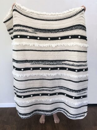 The Anthropology Blanket was designed to use black and white together as neutral colors along with some fur for texture. The results came out lovely. The blanket was then converted to a baby size using soft greys. This would also be a good pattern for using some of the beautiful self-striping yarns that are available now. It is a nice thick, chunky blanket made with Super Bulky Yarn.