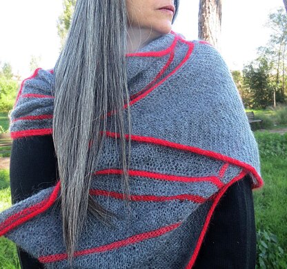 Antinebbia ( Antifog in italian) is a stole/wrap featuring strong color i-cord against a neutral mohair background, reminescent of fog lights emerging from a thick, heavy fog… Antinebbia is worked mostly in garter stitch, in semicircular modules. The modules are started from the lower angle and shaped with increases so to obtain a quarter of circle, and are ended with shiny inserted i-cords. A detailed photo tutorial of this particular technique is included in the pattern. Some short rows are used to add a light divergent movement to the contrasting i-cord color rows. Every module begins from the edge of the previous one, without breaking yarn. No seaming is needed!