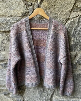 A lightweight cardigan worked in a honeycomb cable pattern with a gradient fade. Worked in fingering or sock yarn with the main colour held together with a strand of lace weight mohair silk yarn, to create a luxurious, soft, slip on cardigan. Choose beautiful hand-dyed fingering or sock yarn fades with a contrast main colour.