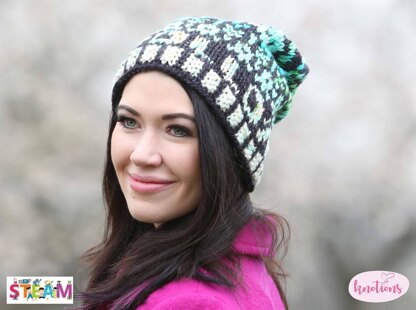This 2-color colorwork hat is worked in the round from brim to crown. The brim section is knitted in corrugated ribbing, adding a nice texture. The body of the hat starts with the word Apollo spelled out, followed by various space-related motifs. The bulky weight yarn knits up quickly and has generous negative ease that will fit most heads/hair.
