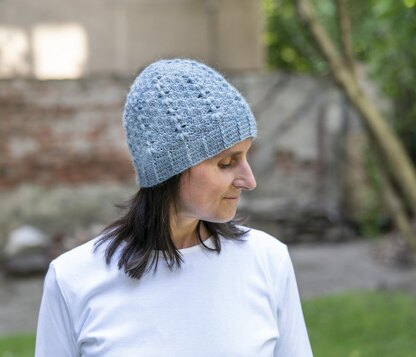 Aquabloom Beta is a textured hat using shells and puffs, worked in the round, from the top down.