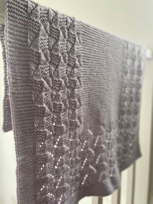 This chunky aran lace baby blanket is a modern take on the classic lace baby blanket. It features a Japanese lace pattern that has been adapted to blend continuously into a garter stitch border and central panel.