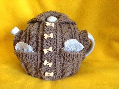 This design has pockets on the front of the Tea Cosy, like an actual waistcoat, so that you can store Tea Bags, sugar sachets or a spoon etc in them.