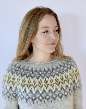 Starting with a simple rolled neckline, this easy top down sweater is knit seamlessly and in the round. A few short rows are worked to shape the shoulders and neck, then the stranded colorwork yoke is worked. There are options for straight sleeves with fitted cuff or shaped sleeves with long cuff. Choose 2 or multiple colors for your yoke - charts are provided for either option. The motifs are easy to knit and suitable for both beginners or those with plenty of colorwork experience. Fingering or sport weight yarn. Designed to be worn with 5-8” 12.5 - 20.5 cm positive ease.