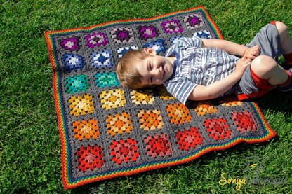 Arc-en-ciel après l’orage (rainbow after the storm) I made this blanket for a friend who loves anything multicoloured. Since it was a surprise and because she wouldn’t know the baby’s gender ahead of time, I based the design on what I knew of her preferences: lots of colours, natural fibres and above all, no white or off-white. She’d already told me she liked granny squares, and everything added up to become this Rainbow after the storm blanket. Material Hook: 5 mm Yarn: Wool of the Andes Worsted (4) from KnitPicks, in the charted colours. 1 skein of each will be plenty, only the grey will require 3 skeins.