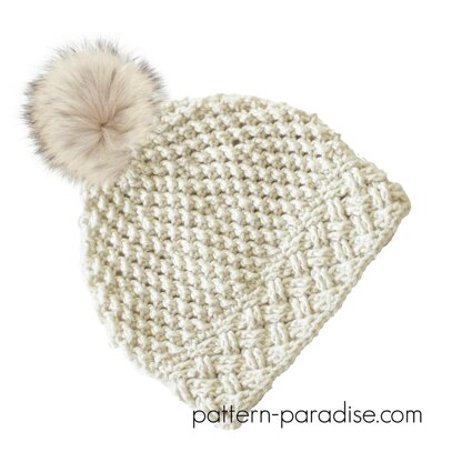 The Arctic Snow Hat has such wonderful texture from the crown to the band. It's thick and warm and perfect for those snowy, wintery days. The band is worked in criss crossed stitches that resemble woven fibers. Add a faux fur pompom or leave it plain, it's lovely either way!