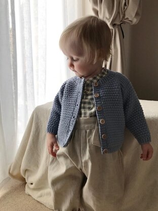 The cardigan is worked from the bottom up, with the body in one piece, then divided at the armholes with back and front sections finished separately. Set-in sleeves are worked flat separately, then attached and seamed at armhole and underarm. The basket stitch instruction is written.
