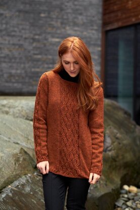 Round knot cables run along the body of this a-line pullover with a slightly longer back. Onlyone cable adorns each sleeve. The body is worked in the round and ends in a round neck with an I-cord bind-off. A false seam on the sides make the fit better. Ardra is Celtic and means noble.