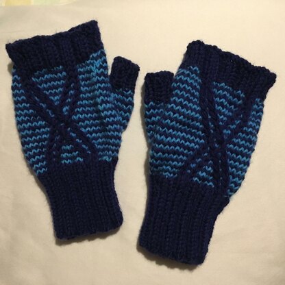 The mitts are about 7" in circumference for size M and 8" in circumference for size L. The main body of the mitt with the design is 4" high. The cables can easily be worked without a cable needle.