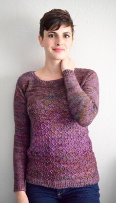 The body of the pullover is knit from the bottom up, seamlessly to the armholes, at which time the front and back are separated and worked flat in reverse stockinette stitch. The shoulders are then seamed together. The set-in sleeves are picked up from the armhole and worked in reverse stockinette from the top-down using short rows to shape the sleeve cap.