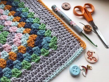 Around the Corner is a simple granny square blanket that uses just ten colours with the perfect colour balance. It’s made up of rows of silver with the contemporary colours plus the border with Silvery Moon and combines four colours on the final round of the border. It’s easy to make and suitable for a beginner. I’ve combined easy standard crochet stitches, including my favourite half treble (htr) cleverly placed for a non-fussy, functional and perfect blanket for making whilst watching TV.