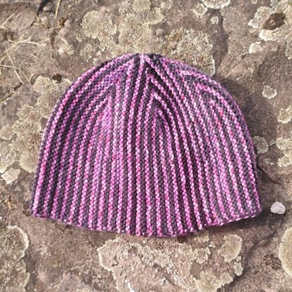 The hat is started with a provisional cast-on. Then the hat is worked in alternating colors, always using one color at a time, in mindless garter stitch. The crown is shaped using short rows with German Double Stitches. Finally the cast-on is joined with the live stitches in garter kitchener stitch for a seamless finish.