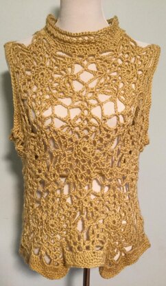 Finished Size Laid flat, the garment measures approximately 11” wide at the neck opening, 5” wide at the shoulder opening, 21” wide from underarm to underarm, approximately 23” wide at the hem. Total length is about 23 inches from top of neck to bottom of pointed petal. The armhole opening is about 9.5” It is a “one-size-fits-most” pattern. Best suited for M-XL fit. Suggestions provided on how to alter motif to fit other sizes.