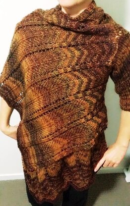This design uses a simple rectangular construction to create a flowing wrap that can be worn multiple ways. I used a self striping yarn to enhance the chevron panels of this pattern.