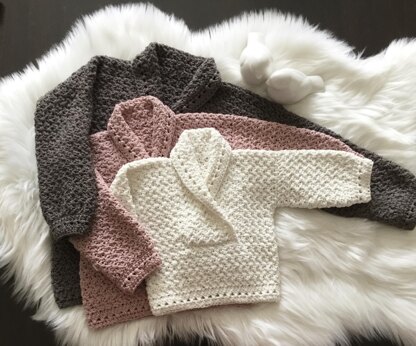 The pattern is for size 0-6 months / 6-12 months / 1-2 years / 3-4 years / 5-6 years. Can be made with cotton blend yarn for spring or wool yarn for colder seasons.