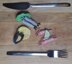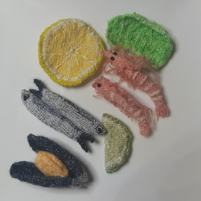This is an easy to medium project, with some color and textural work (stripes and a bobble), embroidery on the citrus fruit and simple crocheting on the shrimp. The ingredients of this aqueous meal are life-sized and vary between 4 and 7 cm.