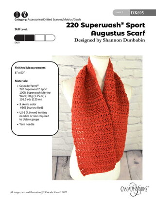 Augustus Scarf in Cascade Yarns 220 Superwash Sport - DK695 - Downloadable PDF is a free Beginner Knitting pattern by Shannon Dunbabin, available as a Downloadable PDF and includes instructions in English. Super fun to make, this pattern could be your next masterpiece!
