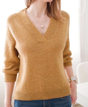 Elegant V-neck sweater with ¾ length sleeves. The sweater is worked seamlessly from top down and requires minimal finishing. The work begins with the back neck section of the ribbed collar. Stitches for fronts, sleeves and back are picked up from the edge of the collar and the upper body is worked in one piece, ribbed collar included. When the raglan increases and V-neck shaping are completed, sleeve stitches are placed on hold and body is worked in the round towards the hem. Sleeve stitches are then placed back on needles and the sleeves are worked in the round towards the cuffs. * Aurinko means sun in Finnish.