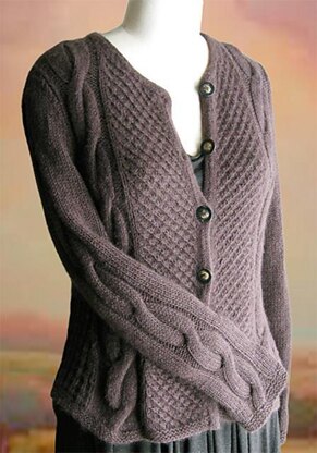 Aurora Canyon is a classic cardigan, fitted, with a slight flare below the waist. Cables and a pretty stitch pattern on fronts and back are flanked by waffle rib side panels that naturally create a flattering scooped shirt-tail shaping above the hips.