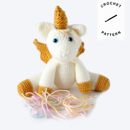 This unicorn pattern as so much fun to work up, especially for the mane and tail. I started by creating all of the body pieces and assembling everything but the wings. I wasn’t sure if I wanted to include the wings or not, so I made them and waited until the end to attach them. For the hair, I used little bonbons of acrylic yarn. Basically, I attached each strand of hair as a tassel on the head and then I brushed the yarn out until it was fluffy. Finally, I used a little trick I learned to make the hair fall softly and add a little bit of shine to it. I even gave Aurora a little haircut to finish! The entire process was much easier than it sounds, and it will be explained in the PDF. This is version 2 of the unicorn pattern, to better suit my changed style.