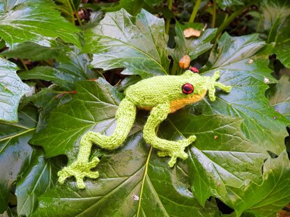 Tension/Gauge is not important for this project. The frog is knitted partly flat, and partly in the round.