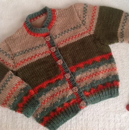 Autumn Breeze is a beautiful blend of autumn shades knitted with only two colours in any one row making it a good project for some one wanting to learn colour work. The pattern is written and I have actually written the colours in rather than say main shade contrast shade etc,.so hopefully all levels of knitters will enjoy. Worked flat on two needles. The back and fronts are worked in one piece until you reach the armhole, saving on seams. I have also knitted this in summer colours and it works up lovely. A great little cardigan for a girl or boy.