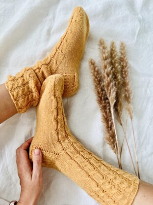 Pattern in English, US knitting terms Skills: knit, purl I used circular needles 80 cm long. But you can easily adapt it to set 4 Double Pointed Needles Pattern include with more yarn suggestions. Pattern comes with more yarn suggestions (Pattern includes linked shopping list). You can use any yarn close to parameters. The pattern includes step-by-step instructions, video tutorials for each step, and a cable pattern charts for each size. This pattern includes video demonstration of the pattern. There are no spoken words in the video, and the directions are all shown in captions. This pattern contains links and QR-codes to video tutorials. Use your smartphone camera to scan the QR-code to view the video tutorials. This is useful if you are printing instructions. The pattern includes four S, M, L-XL, XXL. Picture size M/ Model size XS Easy to adjust foot length to fit your size.