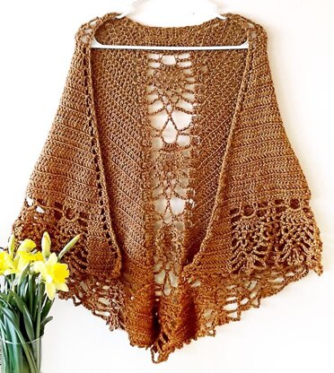 This shawl is crafted from the top down, crocheted using basic stitches to create something unique & feminine. It uses worsted weight yarn, meaning it works up quickly and lends a warmth to it that other shawls rarely possess. This pattern is fully written and also includes a charted section for the lace panel. The upside down pineapple shape (or an autumn leaf, if you will) repeats 3 times down the back, and is then carried into the edging, lending the shawl a whimsical and delicate touch.