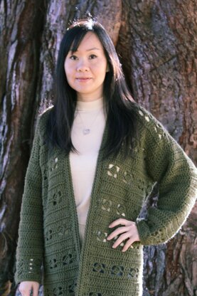 Designed using worsted yarn such as Bernat Satin, this cardigan features minimal seams only at shoulders, with alternating peekaboo leaves pattern throughout! The sleeves are crocheted in rounds with matching leaves pattern at cuffs.