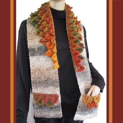 This stunning scarf features colorful fall leaves against "birch bark" with unique "Crocodile Stitch Leaves" collar and pocket trims.