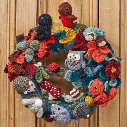 It’s autumn in the forest, and this wreath celebrates the season as the nights draw in and woodlands change colour. The decorations include leaves, acorns, birds and forest animals. This knitting pattern includes the instructions to knit a wreath cover, and all of the decorative elements you can see in the photograph which includes Acorns, Blackbird, Branch, Bunny & Rabbit Hole, Conkers & Shells, Grass Leaves, Hedgehog, Holly Sprig, Horse Chestnut Leaves, Ladybirds, Mistletoe Leaves & Berries, Mole & Molehill, Mouse, Oak Leaves, Owl, Poinsettia, Robin, Silver Birch Leaves, Sloe Bush Leaves & Berries, Snail, Squirrel, and Toadstools. These decorative elements can also be used to decorate other projects, or use them to make brooches or decorate hair slides. Designed by Amanda Berry @fluffandfuzz, all pieces are knitted in 100% merino wool DK yarns on single pointed needles (not in the round). Some pieces are knitted tubes (i-cord) which is worked on two DPNs.