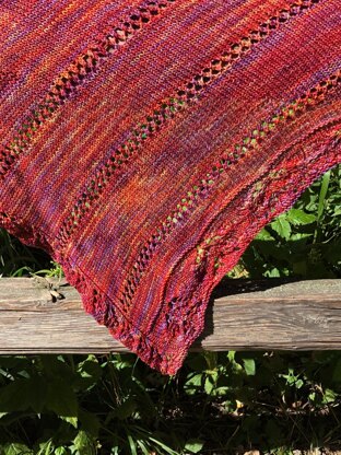 This shawl features a single leaf edging along the side. Then it ends in a double falling leaves lace edging at the bottom. This is worked sideways and in an asymmetrical triangle. It starts small at one end and is worked across getting wider by adding a stitch to one side. There are four open lace work rows in the bottom half to create some light and airiness.