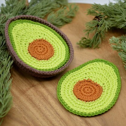 The avocado joins the crocheted coaster family. This set makes a playful and functional addition to your table. When the avocado coasters are stacked up and placed in the little container, the set looks like an avocado half.