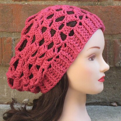 This pattern is for an airy, summery slouchy beanie featuring a large central flower motif, and a pretty openwork stitch pattern. This hat works up lightning-fast, and is perfect for any weather! The pattern comes with easy to follow step-by-step instructions and helpful, clear photos.