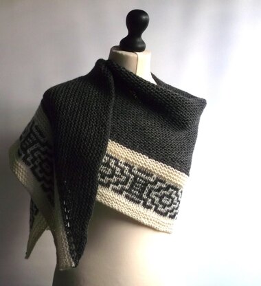 The main body of this shawl is worked bottom up, in garter stitch. The one color, one row mosaic pattern, is then worked top down after picking up stitches from the bottom edge of the main body.